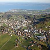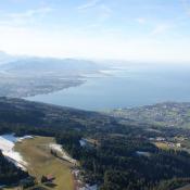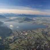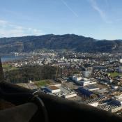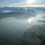 Um 08:30h hob unser HB-QTS mit 2 Piloten, 6 Flaschen Gas und gemütlich eingerichtet ab. Fast gleichzeitig ging hinter den Bergen die Sonne auf und begleitete unsere Fahrt bis zur Landung. Im Süden ein paar Hohe Schleierwolken und über den Seen des Mittellandes ein paar flache Nebelfelder, die sich schon am auflösen waren. Schnell nahm unser Ballon Fahrt auf und bewegte sich mit 40km/h in Richtung Zugersee. Perfekt, dass passte sehr gut.