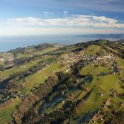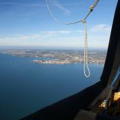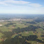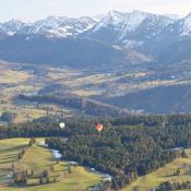 Schon bald lag der Zürichsee für uns, dann das Toggenburg und das Appenzellerland. Die Richtung blieb wie angenagelt bei Fahrtrichtung 70° und das Tempo bei gut 40km/h. Kaum höher als die Hügelzüge links und rechts von uns, flitzen wir über die Landschaft. An der Bodenseeecke bei Bregenz angekommen, liessen wir unsere Sebio-Katze ins Rheintal absinken und die Fahrtrichtung drehte gegen Norden. Mittlerweile waren vor uns zwei Ballone unterwegs, die uns den Weg in Richtung Allgäu anzeigten. Nördlich von uns wurden wir von Urs Frieden mit seinem Ballon begleitet, der schon seit dem Toggenburg parallel zu uns unterwegs war und uns nun, da wir langsamer waren, überholte. Mit knapp 20 km/h fuhren wir auf den Bodensee hinaus, wo wir wieder in den schnellern Südwestwind aufstiegen.