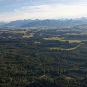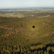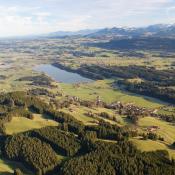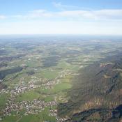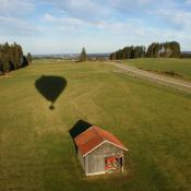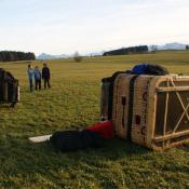 Mittlerweile hatten wir uns auf ein Ziel für unsere Fahrt festgelegt: Wir wollten mindestens 200 km weit fahren und dann einen Landeplatz suchen. Südlich von Marktoberdorf, war dieses Ziel erreicht und weil es nun plötzlich ziemlich bockig wurde (kein Wunder bei über 40 km/h nur 200 m über den Bäumen...), entschieden wir uns kurz vor 15:00h zu landen, obwohl wir erst etwas mehr als die Hälfte von unserem Gasvorrat aufgebraucht hatten.